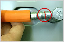 初めにゴムホースにバンドを通した状態で、接続口(ガス栓)に差し込みます。 ゴムホースが入りにくい場合、ゴムホースに水・石鹸水などを付けて入れると楽に入れることができます。 ゴムホースは下部画像ののように、赤いラインまでしっかり差し込んで下さい。次にガステーブルの接続口とゴムホースを取り付けます。