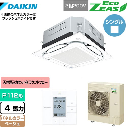 | 仕様・ 特徴 | ストリーマ技術を搭載、360°全周吹出しですみずみまで心地よく。 天井埋込カセット形S-ラウンドフロー<標準>タイプ P112形 4馬力相当 ペア(シングル) 三相200V ワイヤードリモコン 冷房能力:10.0(2.5~11.2)kW 暖房能力:11.2(2.8~14.0)kW 新冷媒R32 ストリーマ除菌ユニット 全周(360°)吹出し 抗菌・防カビフィルター 清潔アルミフィン オートスイング |